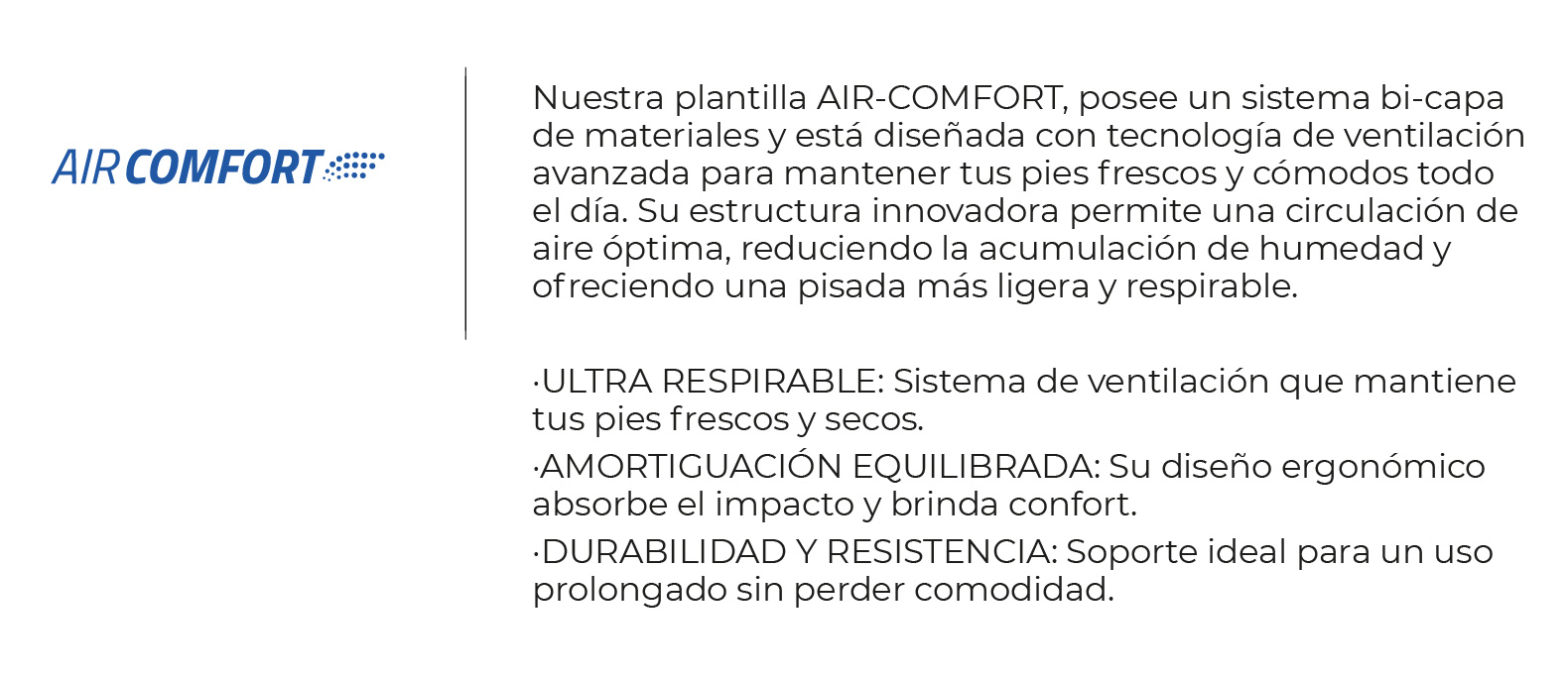 La forrería de Mesh 100% poliéster permite una excelente ventilación interna, mientras que la plantilla Air Comfort, anatómica y ultra respirable, ofrece una amortiguación suave y estable en cada paso.