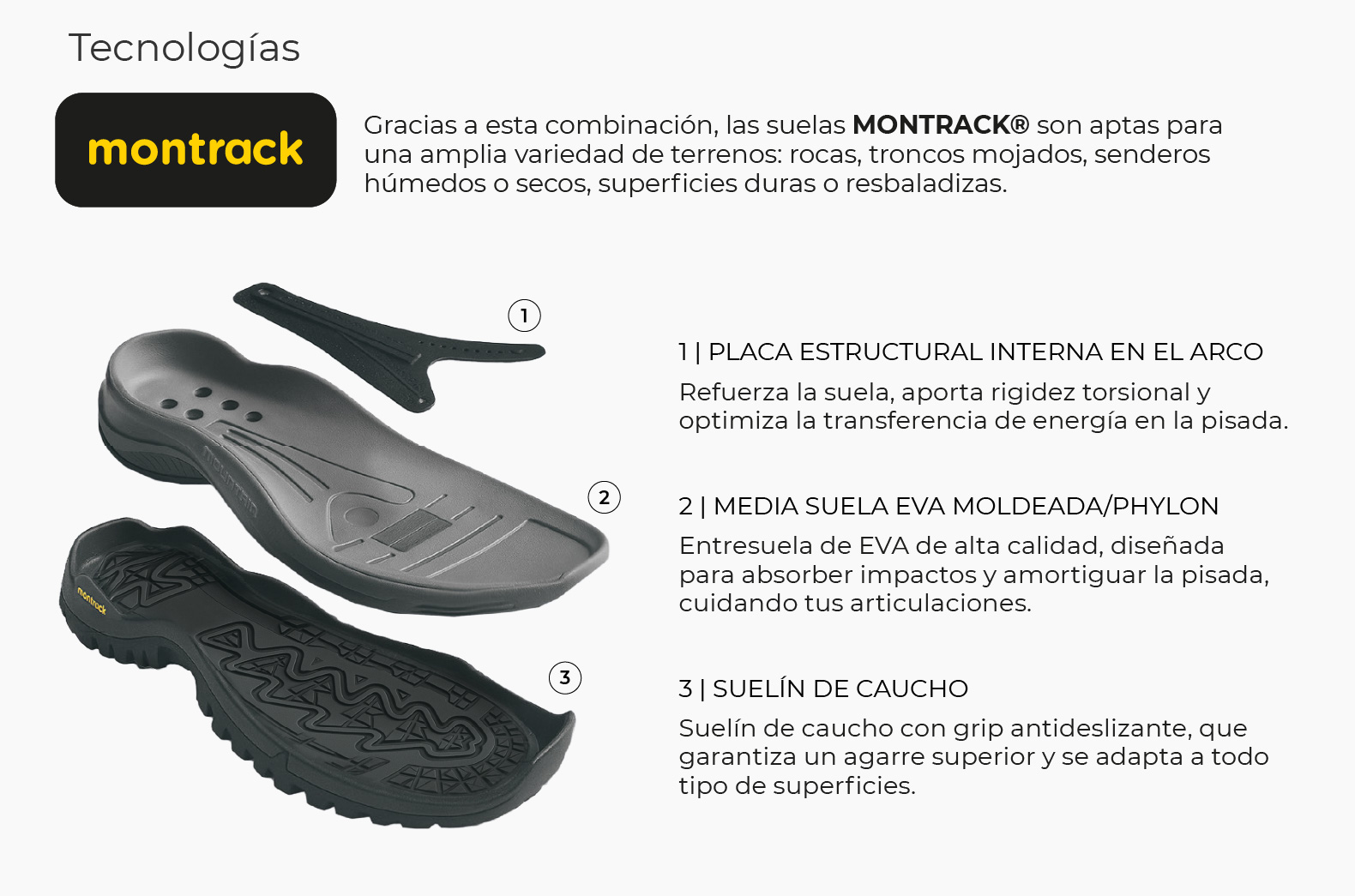 La suela antideslizante incorpora mediasuela de EVA, talonera en TPU para mayor soporte y un suelín de caucho con tracción multidireccional, ideal para asegurar agarre en superficies irregulares, húmedas o resbaladizas.